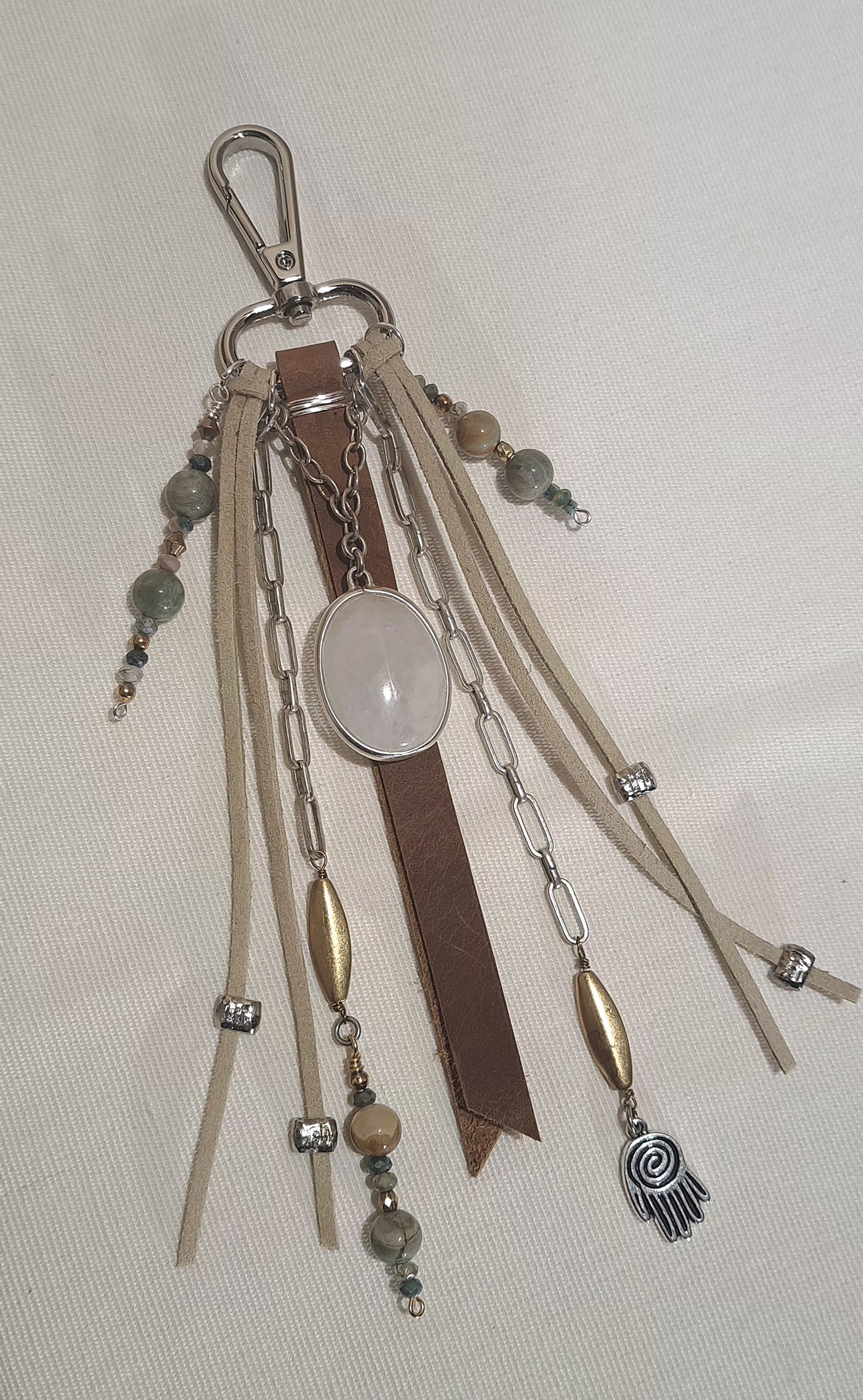 Distressed brown leather bag charm with large ivory oval quartz focal wrapped in steel. Steel paperclip chain frames the leather on each side. One chain has the Hamsa hand charm that is a protective symbol. The bag charm also has green/brown Jasper beads and buff suede tassels adding contrast and movement to this lovely bad accessory. Being all neutrals will allow you to add this bling to any purse or bag you choose.